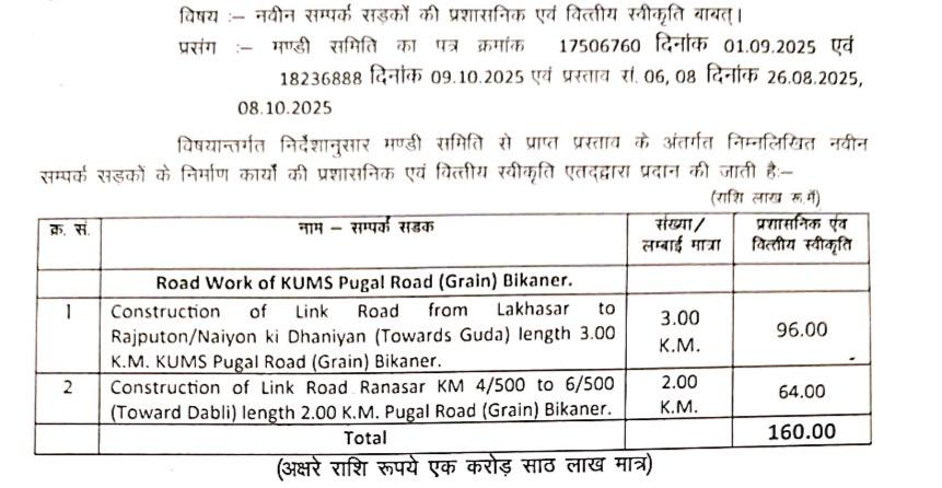 बीकानेर जिले के कोलायत विधानसभा क्षेत्र के ग्रामीणों के लिए राहत भरी खबर सामने आई है। कृषि उपज मण्डी समिति पूगल रोड (अनाज) ने क्षेत्र की दो महत्वपूर्ण सड़कों के नवीनीकरण एवं निर्माण के लिए ₹1 करोड़ 60 लाख की प्रशासनिक व वित्तीय स्वीकृति जारी कर दी है। यह स्वीकृति कोलायत विधायक अंशुमान सिंह भाटी द्वारा दिनांक 03 जुलाई 2025 को प्रस्तुत मांग पत्र के आधार पर त्वरित कार्रवाई के बाद जारी हुई है।