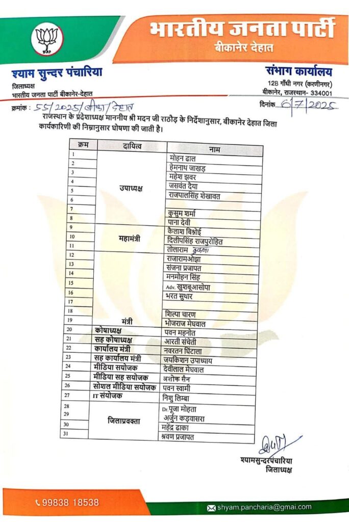 भाजपा प्रदेशाध्यक्ष मदन राठौड़ के निर्देशानुसार बीकानेर देहात भाजपा अध्यक्ष श्याम पंचारिया ने कार्यकारिणी घोषित की है।