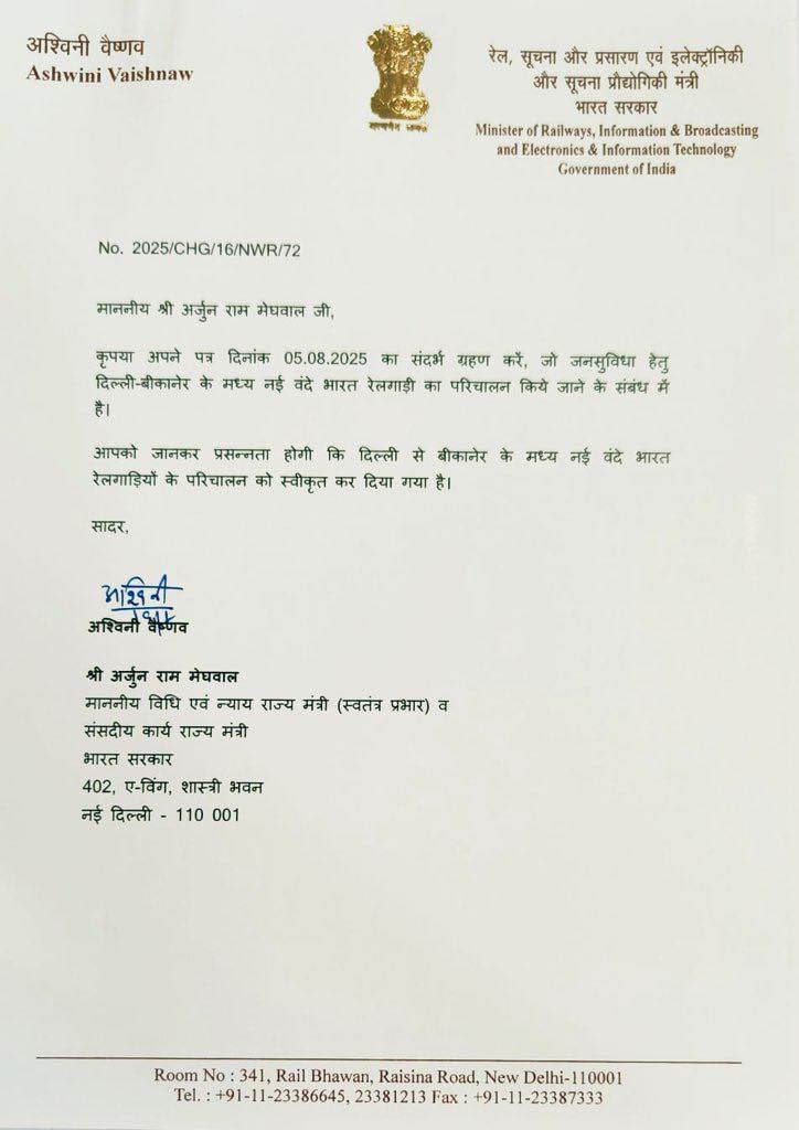 बीकानेर वासियों के लिए बड़ी खुशखबरी है। अब दिल्ली से बीकानेर के बीच नई वंदे भारत एक्सप्रेस ट्रेन शुरू होने जा रही है। यह स्वीकृति रेल मंत्री अश्विनी वैष्णव ने केंद्रीय मंत्री एवं बीकानेर सांसद अर्जुनराम मेघवाल को पत्र लिखकर दी है।