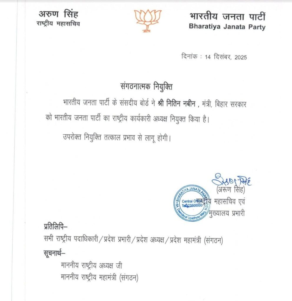 नितिन नबीन लंबे समय से पार्टी संगठन और सरकार दोनों में सक्रिय भूमिका निभाते रहे हैं। बिहार की राजनीति में मजबूत पकड़ रखने वाले नितिन नबीन की नियुक्ति को पूर्वी भारत और विशेष रूप से बिहार के सियासी समीकरणों के लिहाज से बेहद अहम माना जा रहा है। पार्टी नेतृत्व का मानना है कि उनके अनुभव और संगठनात्मक कौशल से भाजपा को राष्ट्रीय स्तर पर मजबूती मिलेगी।
