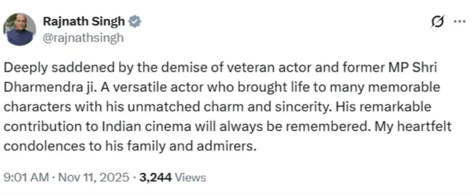 मंगलवार सुबह धर्मेंद्र के निधन की खबरें फैलते ही देशभर में प्रशंसकों ने शोक जताना शुरू कर दिया। यहां तक कि रक्षा मंत्री राजनाथ सिंह ने भी एक्स (X) पर श्रद्धांजलि संदेश पोस्ट किया, जिसे बाद में हटा लिया गया। फिलहाल, धर्मेंद्र की सेहत स्थिर बताई जा रही है और डॉक्टरों की टीम लगातार उनकी स्थिति पर नजर रखे हुए है। परिवार ने सभी से अपील की है कि अफवाहों पर ध्यान न दें और अभिनेता के जल्द स्वस्थ होने की कामना करें।