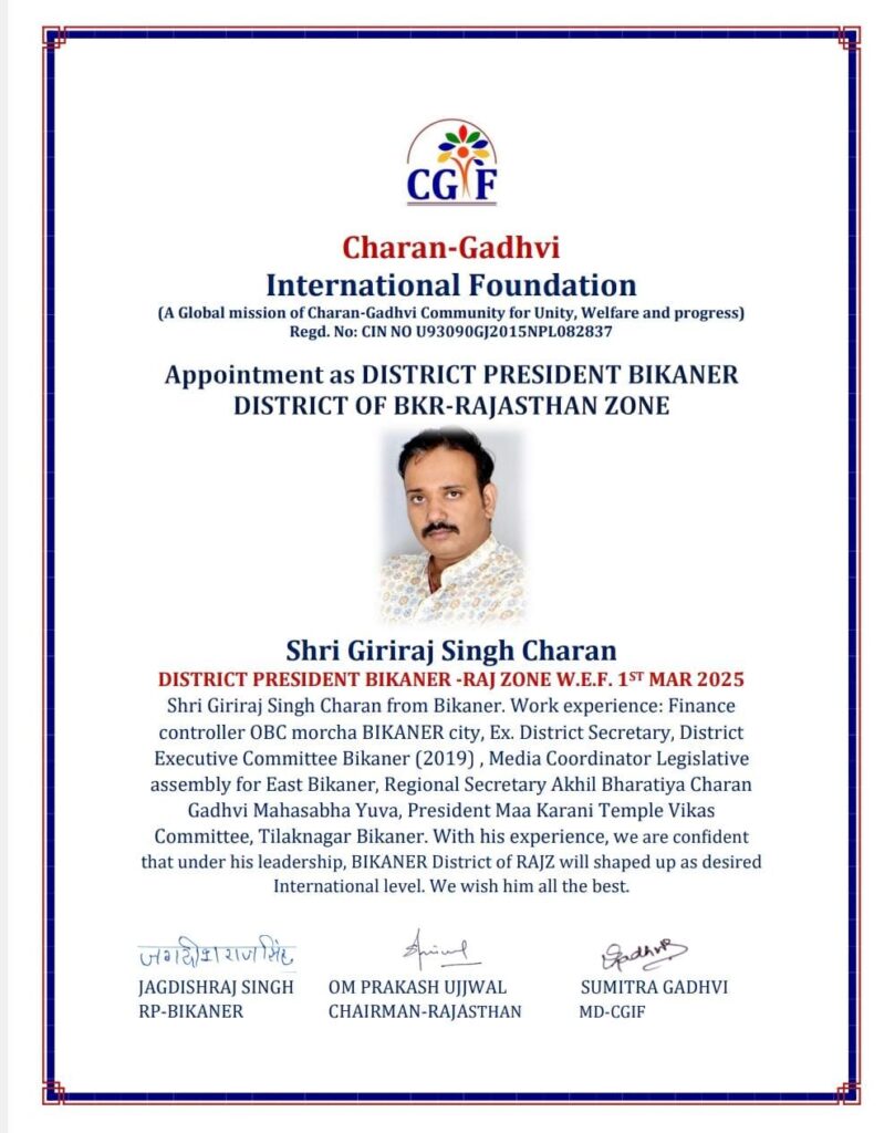 आज चारण गढ़वी इंटरनेशनल फाउंडेशन राजस्थान जोन के चेयरमैन ओमप्रकाश उज्जवल ने फाउंडेशन बीकानेर जिले के अध्यक्ष पद पर गिरीराज सिंह चारण का निुयक्त किया है। चारण इससे पूर्व अखिल भारतीय चारण गढ़वी महासभा में प्रदेष सचिव भी रह चुके है। चारण राजनीति एवं सामाजिक संस्थाओं से जुड़े है। गिरीराज सिंह चारण जल्द ही बीकानेर जिले कार्यकारिणी भी गठित करेंगे।