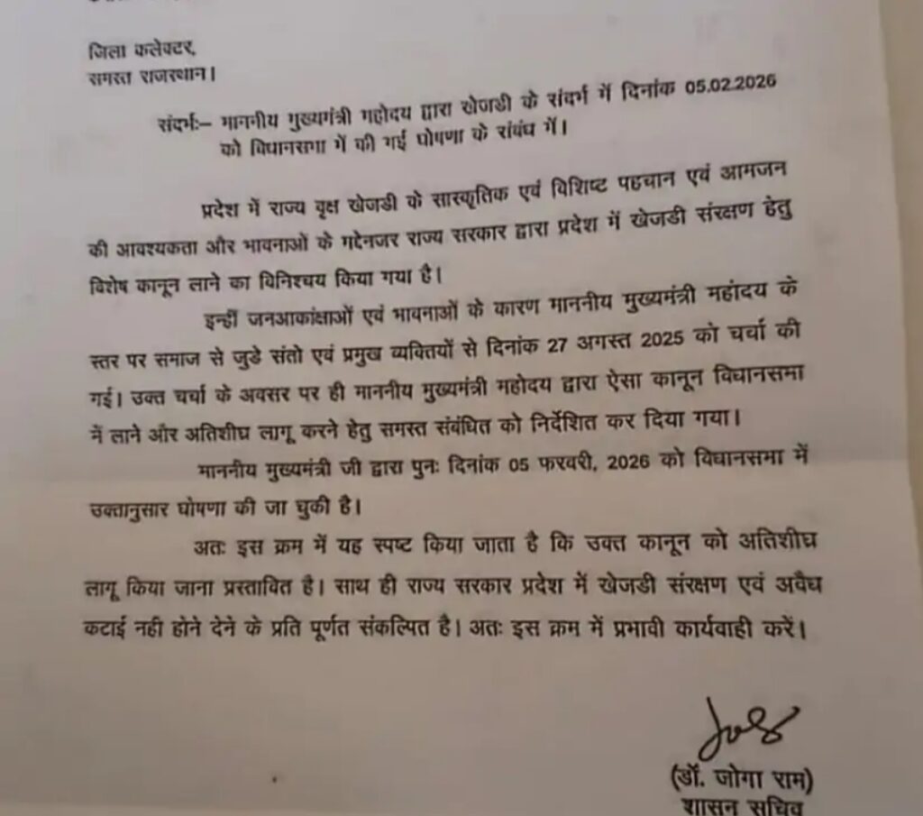 खेजड़ी बचाओ आंदोलन को बड़ी सफलता मिली है। राजस्थान सरकार ने स्पष्ट कर दिया है कि राज्य में कानून बनने तक खेजड़ी के पेड़ नहीं काटे जाएंगे। गुरुवार देर रात राज्य मंत्री केके विश्नोई सरकार का आधिकारिक पत्र लेकर बीकानेर पहुंचे, जिसके बाद 11 दिनों से जारी महापड़ाव समाप्त कर दिया गया।