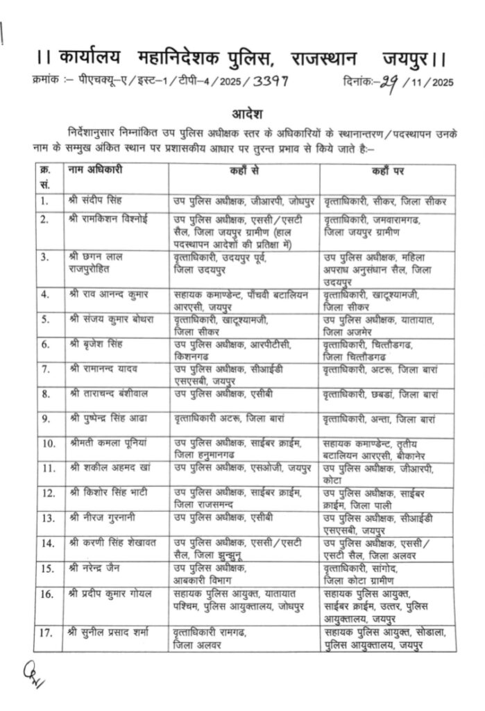 राजस्थान में जारी इस व्यापक तबादला सूची से पुलिसिंग को मजबूती देने और विभिन्न जिलों में प्रशासनिक कार्यों को streamline करने का उद्देश्य बताया जा रहा है। नई तैनातियां आने वाले दिनों में कानून-व्यवस्था को एक नई दिशा दे सकती हैं।