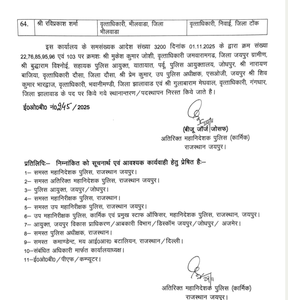शनिवार को एक बार फिर राजस्थान पुलिस महकमे में बड़ा reshuffle देखने को मिला। पुलिस महानिदेशक मुख्यालय, जयपुर की ओर से 64 RPS अधिकारियों की तबादला सूची जारी की गई, जिसके बाद प्रदेशभर के कई जिलों में पुलिस व्यवस्थाओं में अहम बदलाव हुए हैं।